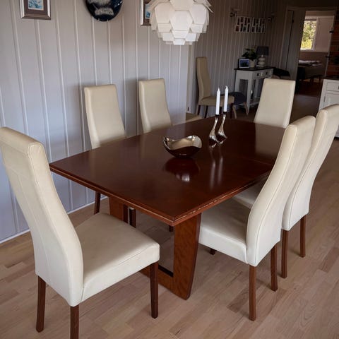 Selger en pent brukt Ventos spisestue fra Bohus. Følger også med ileggsplate. På bordplaten er det noen bitte små merker som er lite synlig. Har alltid brukt duk på. 2 av stolene er lite brukt. Ingen rifter eller stygge merker på stolene. Spisesofaen er også pent brukt