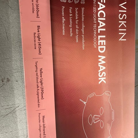 Alvaskin Aurora LED ansiktsmaske i hvit og rosa. Masken leveres med kontrollenhet med ledning, oppbevaringspose og original eske. Designet for bruk i ansiktet, med utsparinger for øyne, nese og munn samt justerbare stropper for feste rundt hodet. Egnet til hjemmebruk som del av hudpleierutine. Eventuelle bruksinnstillinger og programmer styres via håndkontrollen. Manual eller brukerveiledning følger med.