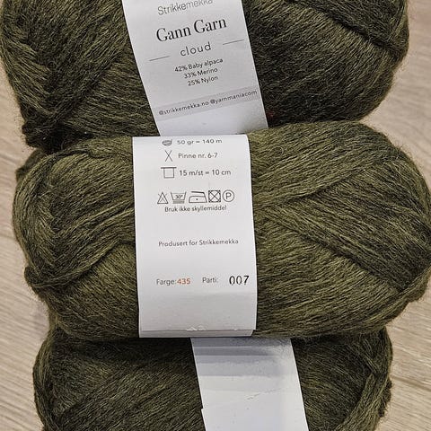 Ellen garn i grønn farge. Nøster med jevn tykkelse egnet til strikking og hekling av plagg og tilbehør. Garnet leveres i flere nøster med samme fargeparti, og har vaskeanvisning og annen informasjon trykket på banderolen rundt hvert nøste.