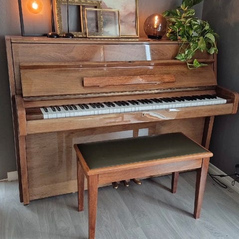 Rippen oppreist piano i lyst treverk. Instrumentet har fullt klaviatur med hvite og sorte tangenter samt to pedaler i metall. Klassisk, rett design med lukket front og lokk over tangentene.