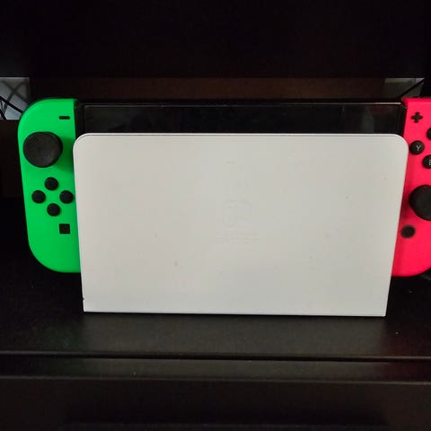 Nintendo Switch OLED spillkonsoll i hvit utgave. Konsollen har OLED-skjerm og avtakbare Joy-Con-kontrollere i hvitt. Egnet for bruk både som håndholdt konsoll og til spilling på TV via dokkingstasjonen. Selges da det dessverre ikke blir brukt lenger. Alt på bildene følger med.