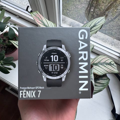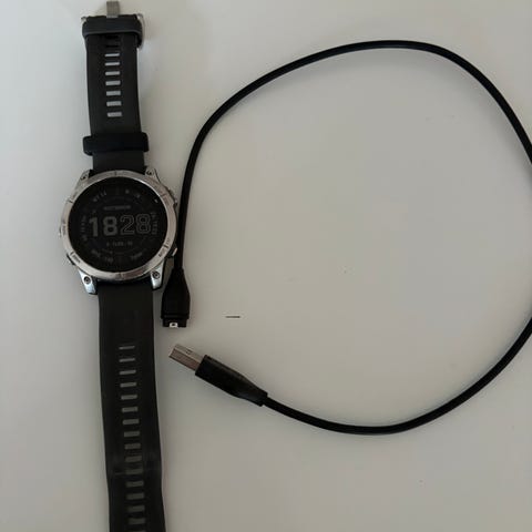 Garmin Fenix 7 smartklokke med urkasse på 47 mm og grønn silikonreim. Klokken har rund skjerm og flere knapper rundt urkassen for navigasjon i menyene. Baksiden har optisk pulssensor og lade-/datakontakter. Egner seg til bruk som treningsklokke og aktivitetsmåler, samt til daglig bruk som smartklokke med varsler fra tilkoblet mobiltelefon, tidsvisning og andre standard funksjoner for denne modellen.