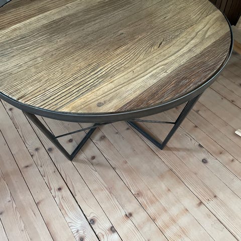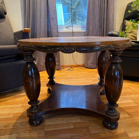 Bordet i tre. Bordet har utskårne detaljer på ben og kant, og en rund bordplate i treverk. Egner seg som, sidebord eller sofabord i stue eller spisestue.