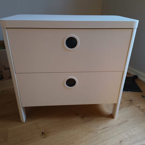Veldig pent brukt kommode fra IKEA i serien Busunge. To gode skuffer med runde håndtak, disse har plast i seg så det ikke kommer støv på innsiden. Ser veldig pen ut og har stått på ett rom hos ett barn.