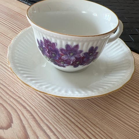 Porsgrund kopp i porselen med hjerte-dekor. Koppen har hvit og lys blå bakgrunn med rødt hjerte og detaljer i gullfarge. Høyden er ca. 9 cm, og diameteren øverst er rundt 7 cm. Passer til varme og kalde drikker ved frokostbordet, på kjøkkenet eller på kontoret. Basen er merket med Porsgrund-logo og årstall 1885–2014.