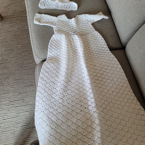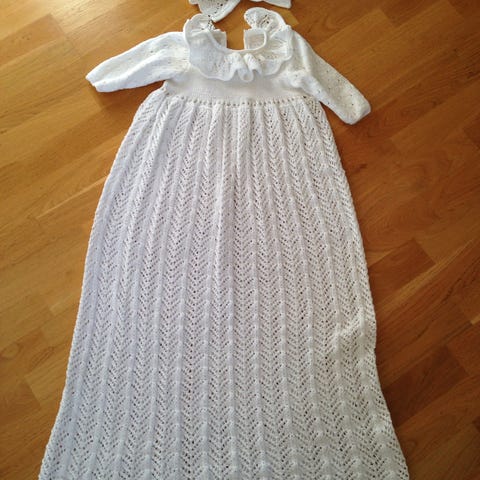 Hjemmestrikket dåpskjole med lue,str 0-3/4 mnd.Rosa og blått bånd følger med.