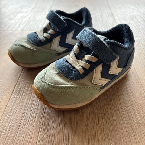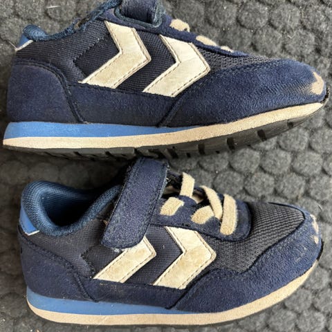 Hummel joggesko for barn i størrelse 33. Skoene er unisex og kommer i mørk blå farge med lyse detaljer og hvite lisser kombinert med borrelås. Lite brukt