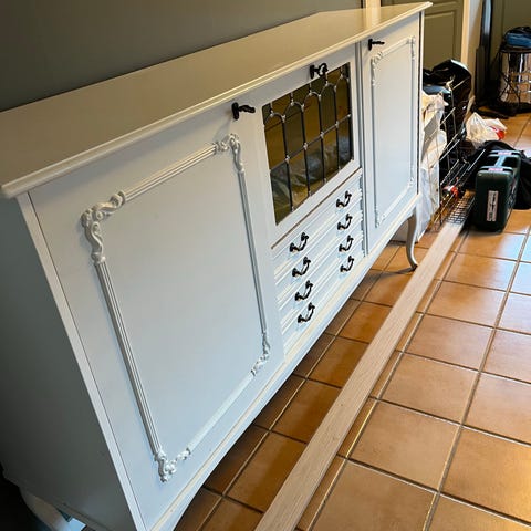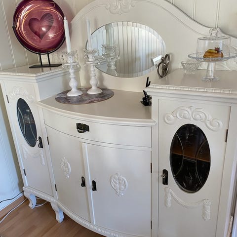 Selger en flott skjenk i klassisk design med fine detaljer. Møbelet har en lys, tidløs farge som passer godt inn i de fleste hjem.