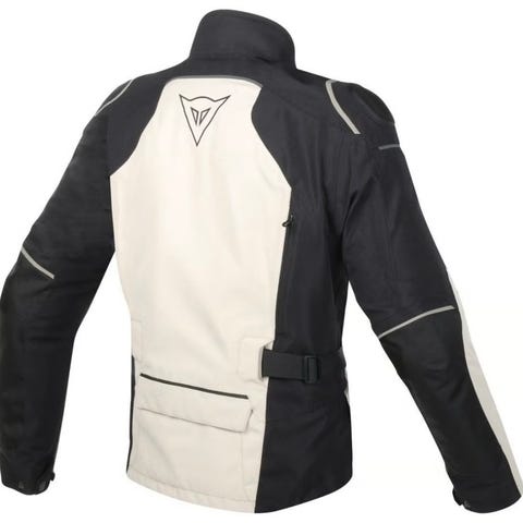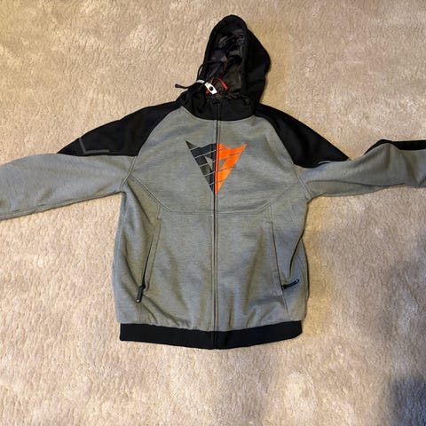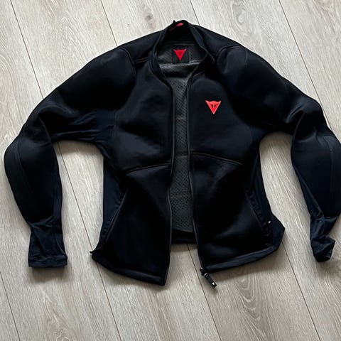 Svart Dainese jakke, størrelse 48. Jakken har snøring i hetten, glidelås i hel lengde og to lommer. Det er en stor Dainese-logo på brystet. Innsiden er helfôret for komfort. Det er skulder- og albuebeskyttere. Ryggbeskyttere kan også legges til.
