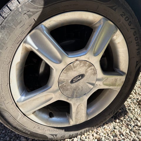 4 stk 205/60-16 eldre sommerdekk m 6-7mm mønsterdybde på originale Ford alufelger 5x108 et 52,5 nav 63,4