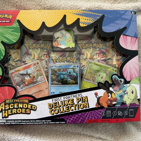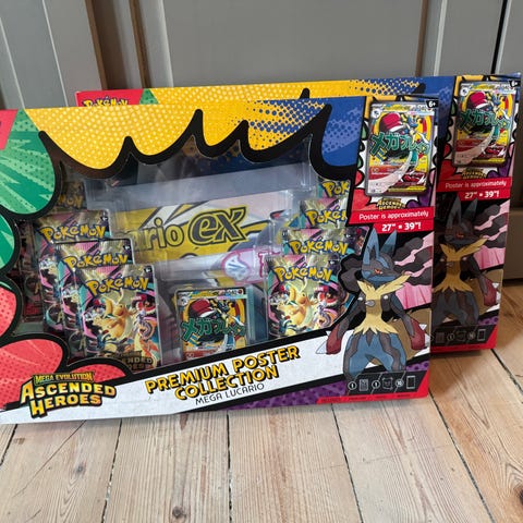 Boksen inneholder flere boosterpakker med Pokémon-samlekort, et promokort med Mega Lucario EX, en samlefigur av Mega Lucario og en plakat/poster med motiv av Mega Lucario. Settet tilhører temaet Mega Evolution Ascended Heroes og er beregnet for bruk sammen med Pokémon Trading Card Game.