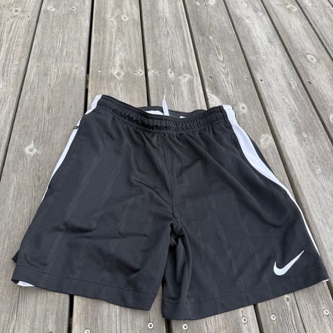 Nike Dri-Fit fotballshorts for barn i størrelse 152 (ca. 147–158 cm). Shortsen er grå med gule felt langs sidene og har elastisk linning. Laget i 100 % polyester med fukttransporterende Dri-Fit-materiale som tørker raskt. Egnet til fotball og annen fysisk aktivitet for barn i alderen ca. 12–13 år.
