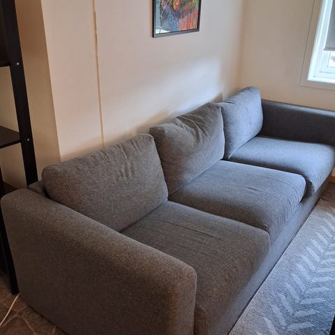Lys og pen sofa som består av 3 deler. Hver del er ca 100×100cm. En hjørnemodul, en med rygg og en puff. Kan settes sammen på ulike måter. Dun i putene. Det er noen små flekker på en av sitteputene (se bilde). Modulene krever litt plass, og tok litt for mye plass hos meg😅