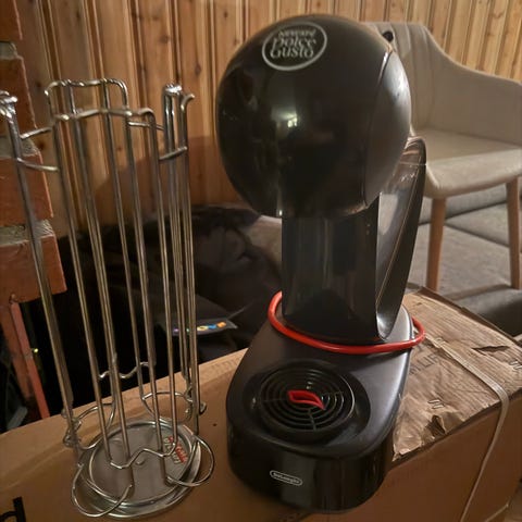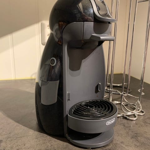 Maskinen har vannbeholder på baksiden og dryppbrett foran for kopp. Strømkabel med jordet støpsel. Egnet for bruk på kjøkkenbenk eller lignende flate overflater. Kompatibel med Nespresso-kapsler av typen som vises på bildene (Dolce Gusto-system).