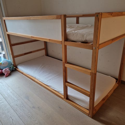 IKEA køyeseng i metall i grå farge. Lite brukt . Sengen har integrert stige i enden og sengehest på overkøye for økt sikkerhet. Rammen er laget av metall med rette linjer og åpne gavler. Egnet for barnerom eller gjesterom der man ønsker to soveplasser på liten gulvflate. Madrasser følger med