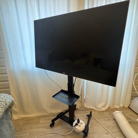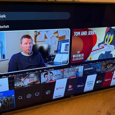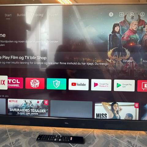 LG TV med tilhørende fjernkontroll i svart. TV-en har smartgrensesnitt med tilgang til ulike strømmetjenester via menyen på skjermen. Fjernkontrollen har dedikerte knapper for blant annet Netflix og andre funksjoner, samt batteriluke på baksiden. Egnet som TV til stue, soverom eller andre rom der det er behov for en flatskjerm med smartfunksjoner. Nærmere tekniske spesifikasjoner som skjermstørrelse og oppløsning er ikke oppgitt.