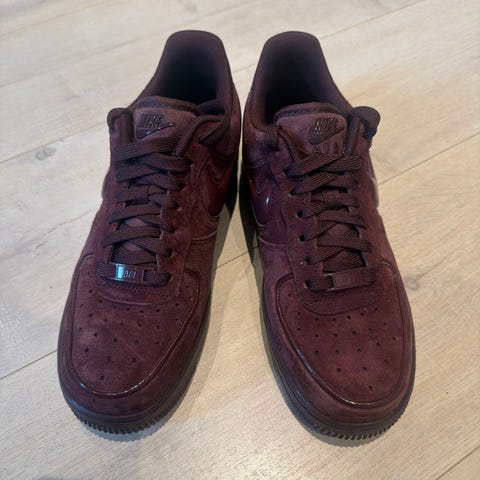 Nike joggesko sneakers i størrelse 39. Skoene er i en burgunderrød farge med lys mellomsåle og mørk yttersåle. Overdelen består av tekstil og syntetiske materialer med karakteristiske linjer og liten Nike-logo på siden