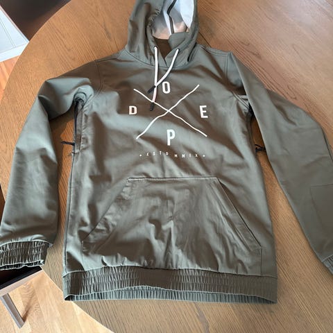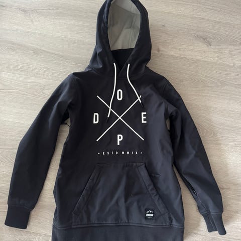 Dope jakke for herre i størrelse S. Jakken er svart og laget i polyester. Modellen har hette med snøring, stor kengurulomme foran og trykket Dope-logo på brystet. Passer til fritidsbruk og utendørsaktiviteter i mildt til kjølig vær. Jakken er brukt 2 ganger og har ingen bruksmerker!