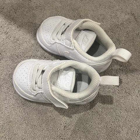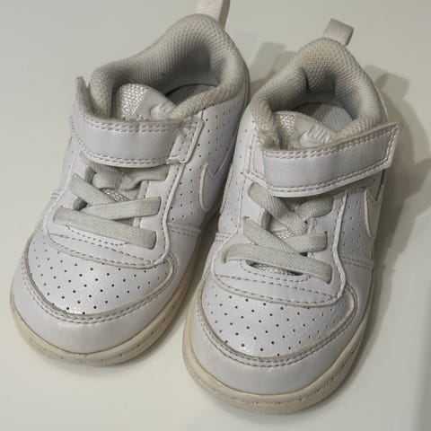 Nike barnesko i størrelse 22 (EU), unisex. Modellen har overdel i syntetisk materiale med lisser og borrelås for enkel lukking. Fargen er hvit. Yttersåle i gummi med mønster for grep. Passer til hverdagsbruk for små barn.