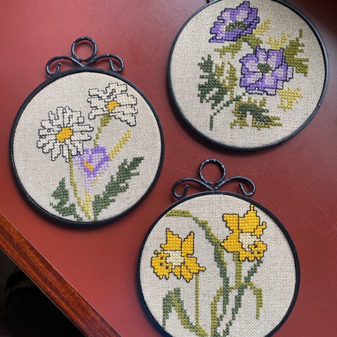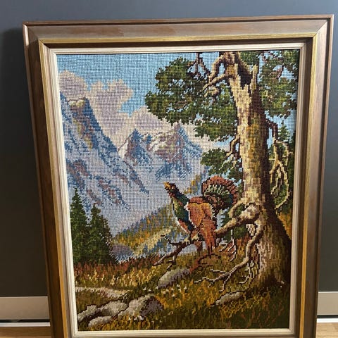 Selger et klassisk brodert bilde med naturmotiv – fjell, vann og skog. Gir en rolig og nostalgisk stemning, perfekt til hytte eller tradisjonelt interiør.