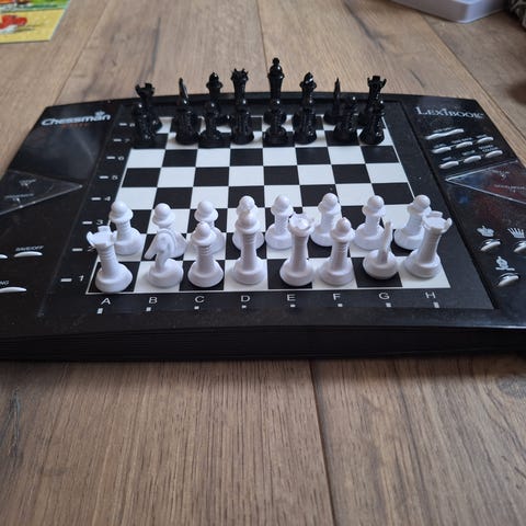 Vintage spillbrett. Millennium Schachmeister Pro elektronisk sjakkspill i hvit og svart. Spillet består av et elektronisk sjakkbrett og andre spill. Brikkene er magnetisk. Treningsbrett/spillbrett.
