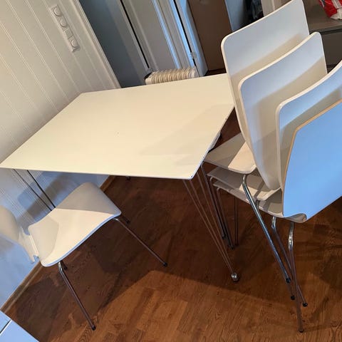 Hvitt spisebord med rektangulær bordplate og fire ben. Bordet har uttrekksfunksjon med ekstra plate på begge sider, som gir mulighet for å utvide bordflaten ved behov. Passer som lite spisebord eller kjøkkenbord i mindre rom eller spiseplass. Materialet fremstår som malt treverk eller lignende.