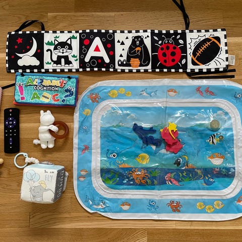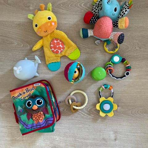 Inkluderer rangler, myk bok, motorikkleker og leker med lyd.