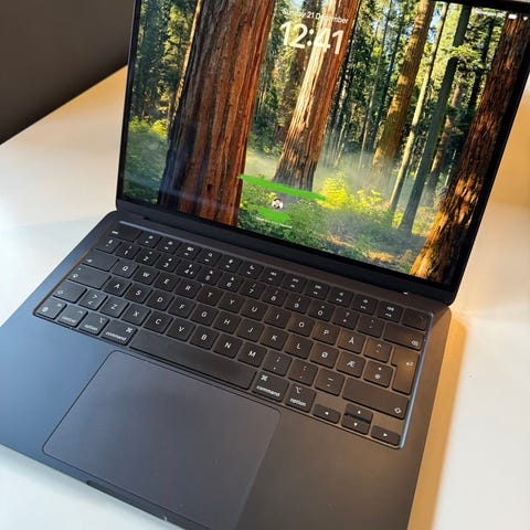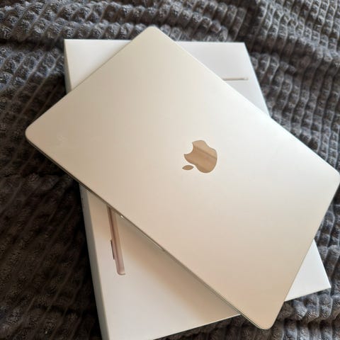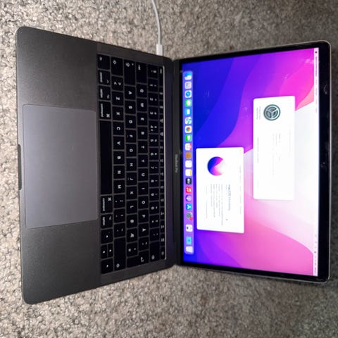 Selger en Apple bærbar PC med ca. 13-tommers skjerm i svart farge. Den kommer med Apple Magic Mouse (2024-modell) i svart.