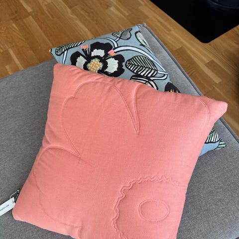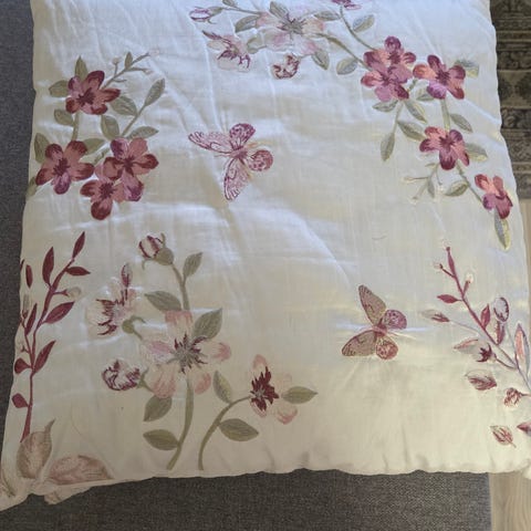 Kid putetrekk med blomster mønster i lilla toner. Den ene siden har dekorativt blomstertrykk på lys bunnfarge, mens baksiden er ensfarget lilla. Trekket har glidelåslukking i siden. Egnet til bruk i sofa, stol eller på seng som pyntepute. Materiale og nøyaktig størrelse er ikke oppgitt.
