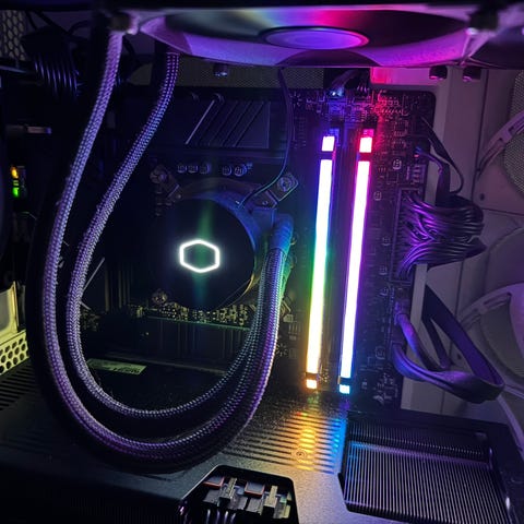 Skjermkort med vannkjøling for stasjonær PC. Bildene viser et kort utstyrt med fullcover vannblokk og tilkobling til et lukket vannkjølingssystem med RGB-belysning. Løsningen er beregnet for montering i et kabinett med tilpasset vannkjølingsoppsett eller bygge om til vifter igjen.