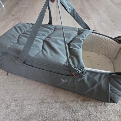 Voksi CARRY ME i meadow green farge. Kjøpt ny i mai i fjor og stått ubrukt siden november. Vi har derfor ikke behov for denne lenger. Den har polstret innside med ei liggemadrass inni. Avtagbar topp.