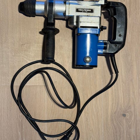 Velfungerende Power Craft borhammer for boring og meisling i harde materialer. Nettdrevet modell med pistolgrep og ekstra støttehåndtak for bedre kontroll. Huset er i metall med svart og sølv utførelse, og maskinen har grønn betjeningsknapp. Egnet til arbeid i for eksempel betong, mur og stein der det kreves slagfunksjon i tillegg til vanlig boring.