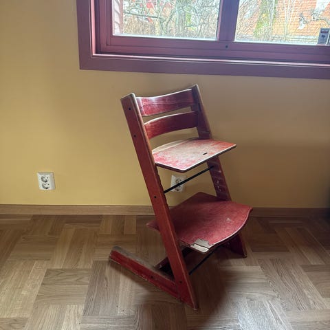 Stokke Tripp Trapp høy barnestol i brunt tre. Stolen har justerbart sete og fotbrett som kan flyttes i høyden etter barnets størrelse. Klassisk design som passer til spisebord eller andre bordhøyder der barnet skal sitte sammen med voksne. Laget i treverk med gjennomgående hull i sidene for regulering av setedybde og fotbrett. Egnet som sitteplass for barn som kan sitte selv og oppover, innenfor vekt- og aldersgrenser anbefalt av produsenten.