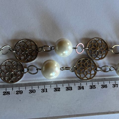 Dette er en tradisjonell norsk sølje, sannsynligvis i oksidert sølv med svarte perler, som brukes som tilbehør til bunad eller festdrakt.