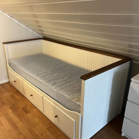 IKEA dagseng med skuffer i hvit utførelse. Sengen har høy rygg og sidekanter som gjør at den kan brukes både som sofa på dagtid og seng om natten. Under sengen er det flere uttrekksskuffer som gir ekstra oppbevaringsplass til for eksempel sengetøy eller leker. Egnet til barnerom, ungdomsrom eller gjesterom. Madrass og tekstiler følger med kun dersom det er oppgitt i annonsen for øvrig.
