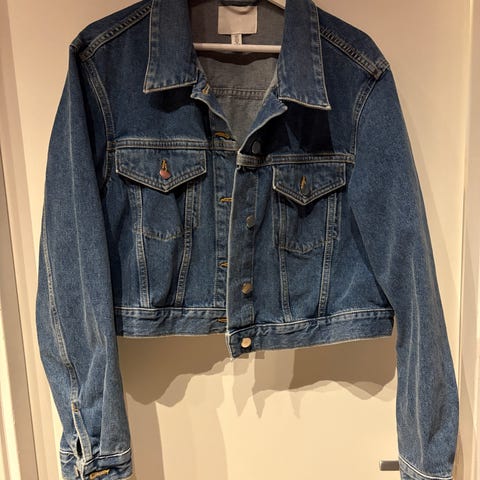 H&M dongerijakke for dame i størrelse L. Jakken er i blå denim med klassisk snitt, krage og knappelukking foran. To brystlommer med klaff og knapp, samt to skrålommer i sidene. Ermene har mansjetter med knapp, og nederst på jakken er det justerbare knapper i siden. Passer som ytterlag i mildt vær eller som et lag over genser eller topp.