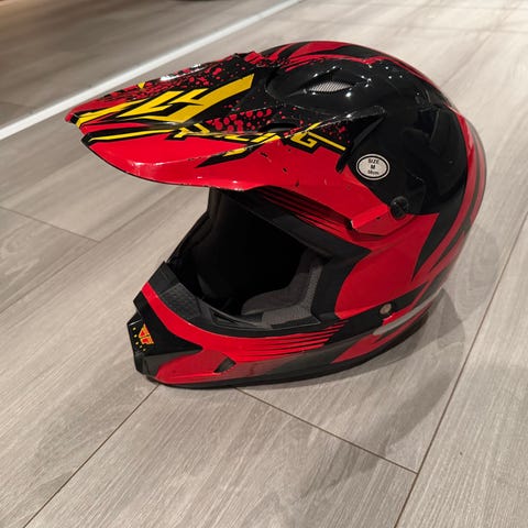 Motocrosshjelm i helhjelm‑utførelse i svart og blå med grafiske detaljer. Hjelmen har fast hakeparti, skjerm i front og ventilasjonsåpninger. Innvendig er den polstret med rødt og mørkt fôr for økt komfort, og den har hakestropp med låsemekanisme. Egnet for bruk til motocross, enduro eller lignende motorsport der helhjelm er påkrevd. Størrelse og eksakt merke/modell fremgår ikke av bildene og bør kontrolleres ved kjøp.