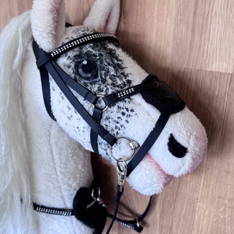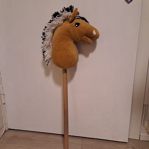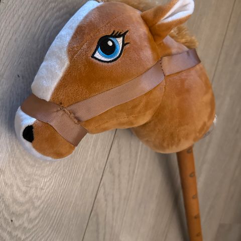 Sprell kjepphest. Hesten har gul man og hale i garn, samt hodelag i gullfarge. Medfølgende blått hestedekken med gul kant og egen blå hette til hestens hode (Panduro).