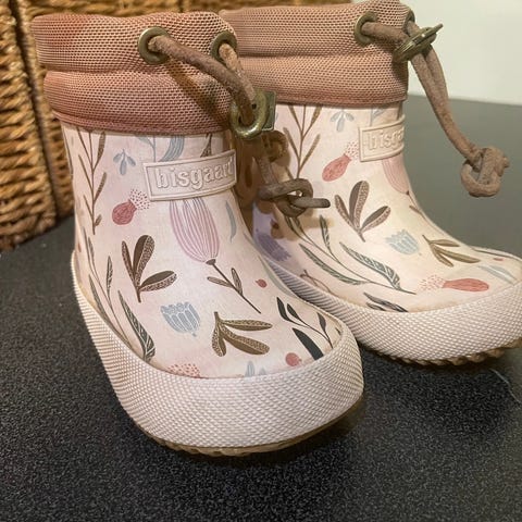 Bisgaard gummistøvler unisex i størrelse 22. Støvlene er i blå gummi med blomstermønster og har tekstilkant øverst. Egnet som regnstøvler til barn, med såle i gummi som gir godt grep på vått underlag.