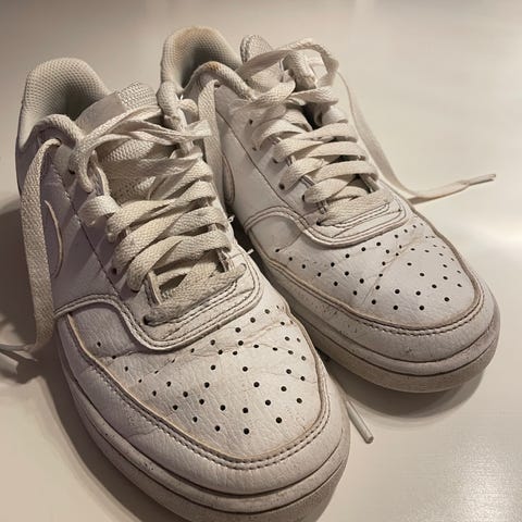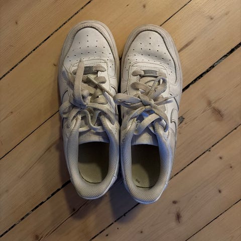 Nike Air Force 1 joggesko for barn/unisex i størrelse 37. Skoene er i hvit farge med klassisk Nike-logo på sidene. Overdelen er i skinn med perforeringer i front for ventilasjon. Yttersåle i gummi med mønster for grep. Lav modell som passer til hverdagsbruk og fritidsaktiviteter. Skoene har snøring for justering av passform. Det anbefales å se gjennom bildene for inntrykk av brukstilstand og slitasje, spesielt rundt hælpartiet og sålekantene.