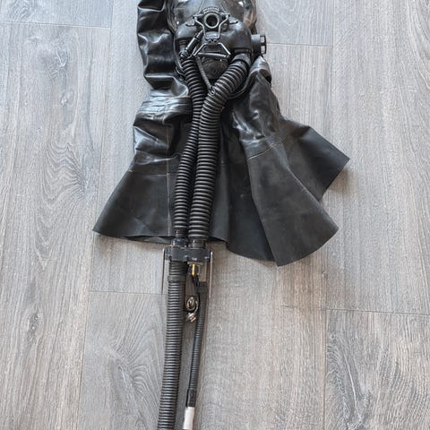 Maskens gummi er preget av elde og gummien er sprukket på slangen og på masken. Se bilder.