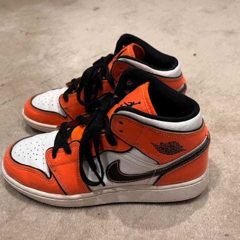 Nike Air Jordan 1 Mid joggesko i svart og rød farge. Str 36. Modellen har mellomhøyt skaft med klassisk Air Jordan-logo på siden. Overdelen er i syntetisk materiale og lærimitasjon, med snøring foran. Yttersålen er i gummi med profil for godt grep. Passer til hverdagsbruk og fritidsaktiviteter.
