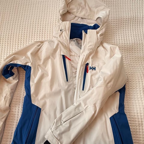 Helly Hansen jakke, dame i størrelse S. Jakken er hvit og laget i polyester. Modellen har hette, hel glidelås i front og flere glidelåslommer både utvendig og innvendig.