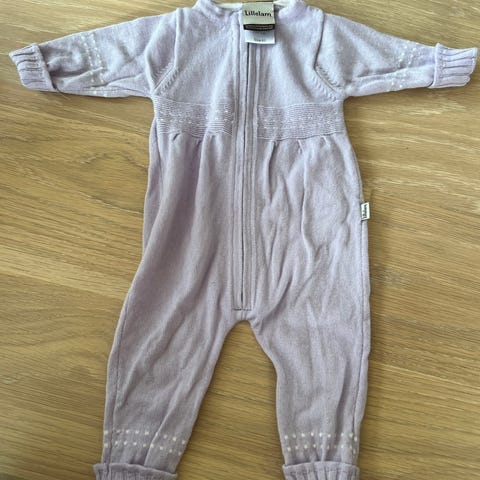 Lillelam ulldress i merinoull i størrelse 62, unisex. Dressen er rosa og strikket i 100 % merinoull.