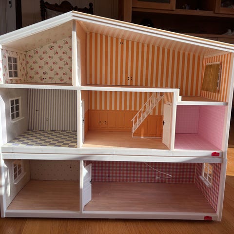 Dukkehus som kan regnes som oppussingsobjekt. Møbler som er litt for store til huset, men det går med et nødskrik