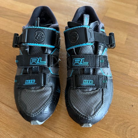 BIRK sykkelsko for terreng med klikkpedal-feste. Skoene er i størrelse 37 og har overdel i syntetisk materiale med borrelåsstropper og spenne for justering av passform. Sålen har grovt mønster tilpasset bruk på terrengsykkel og innfelt klossfeste. Fargen er hovedsakelig svart med grå detaljer.