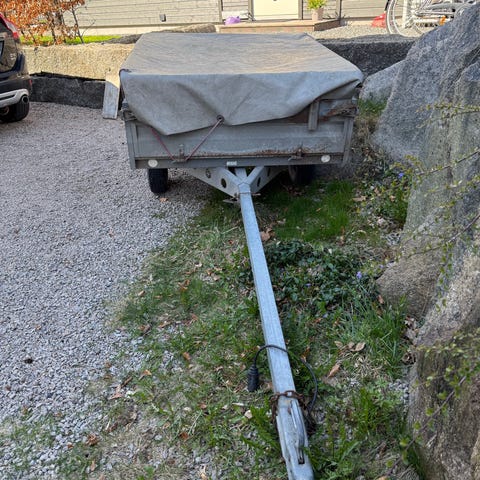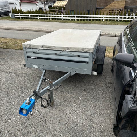Tilhenger åpen plan tilhenger i grå utførelse. Hengeren har åpent plan med flatt lastegulv og enkel aksel. Den er utstyrt med lys og registreringsskilt bak, samt støttehjul og drag foran. Felgene er stålfelger med dekk tilpasset tilhengerbruk. Egner seg til transport av ulike typer last innenfor lovlig totalvekt og dimensjoner for tilhengeren.