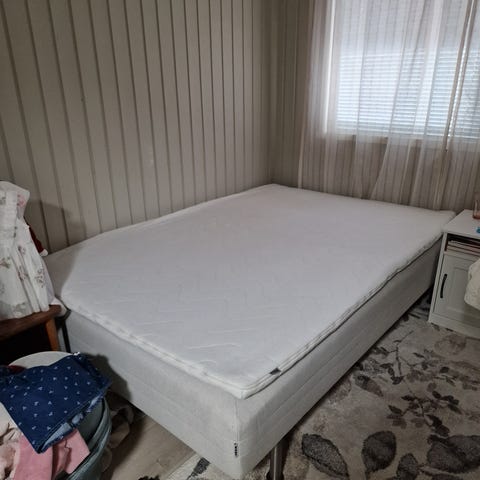 Hvit dobbeltseng i 140 cm bredde med 4 skuffer under, inkl. madrass og overmadrass. Pent brukt. Må hentes i Hunndalen, Gjøvik, mandag 30. mars.
