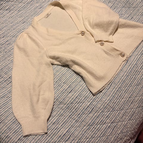 b.young cardigan for dame i størrelse M. Strikket modell i blå farge med v-hals og store knapper foran. Laget i akryl. Cardiganen har puff ermer og rett passform, egnet til hverdagsbruk og lag-på-lag antrekk.