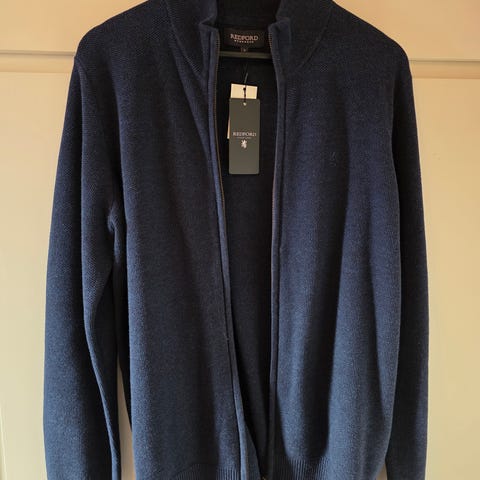 Redford Cleveland cardigan ulljakke for herre i størrelse L. Jakken er blå med mønstret parti over bryst og ermer. Laget i ull, med glidelås i front og høy hals. Passer som varm og behagelig overdel til hverdagsbruk eller som mellomlag på kjølige dager.